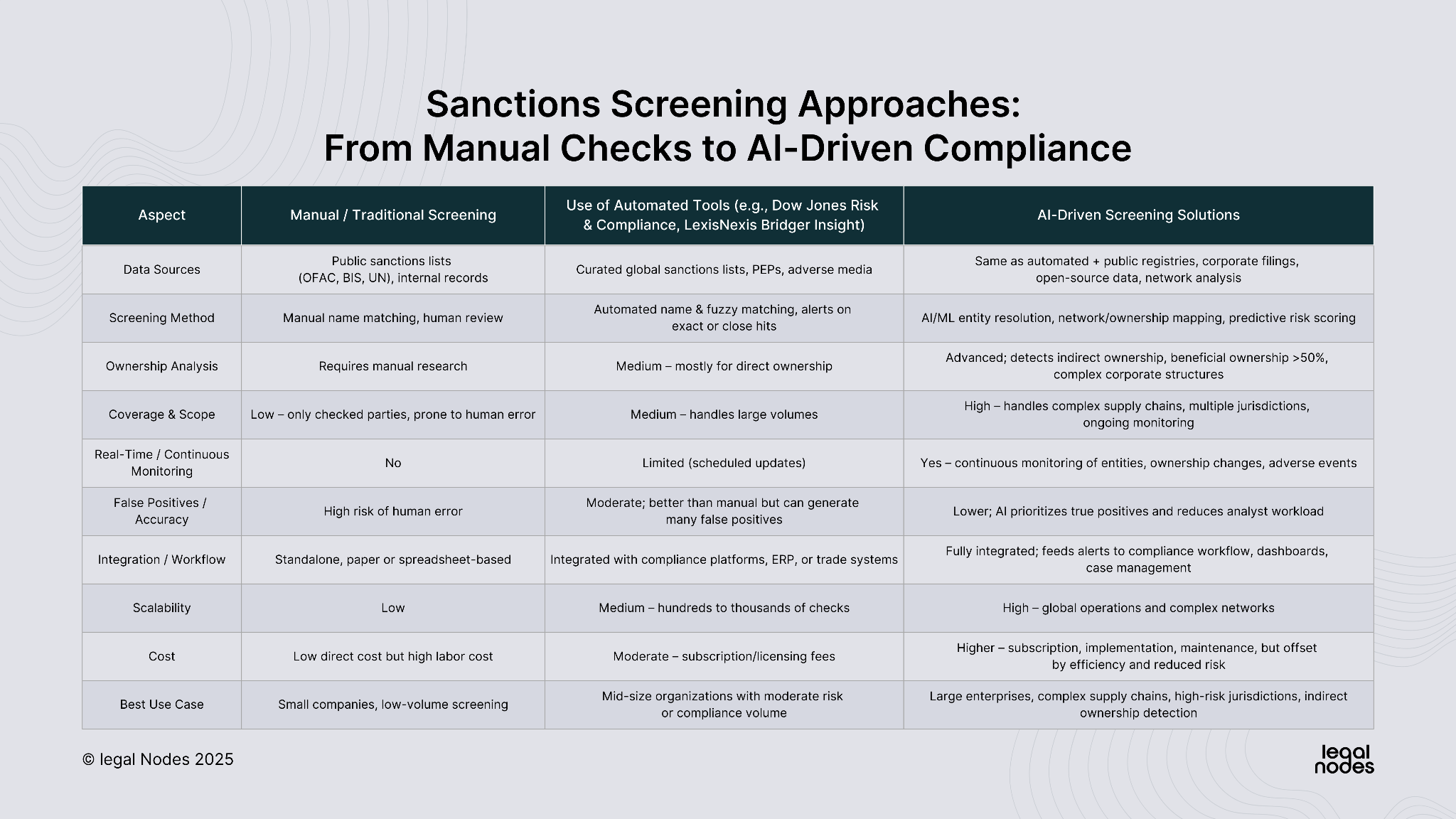 The table below compares manual, automated, and AI-driven sanctions screening approaches, helping you to understand the strengths, limitations, and best use cases for each in the context of parts transactions.