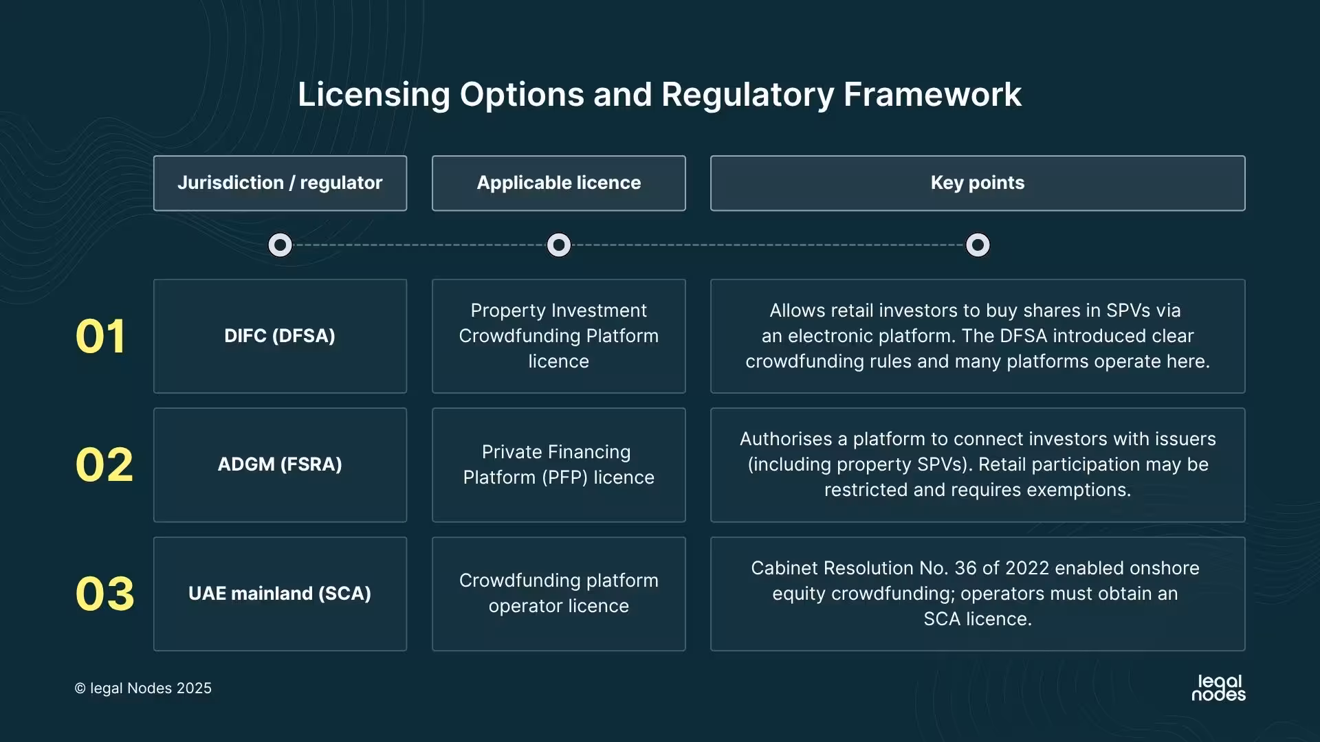 - Operational controls: Platforms must maintain separate client accounts, perform AML/KYC checks and provide robust IT systems. Retail investor limits apply – e.g., DFSA‑regulated platforms cap individual investment per property and overall holdings. Regular reporting to the regulator and audited financial statements are mandatory.