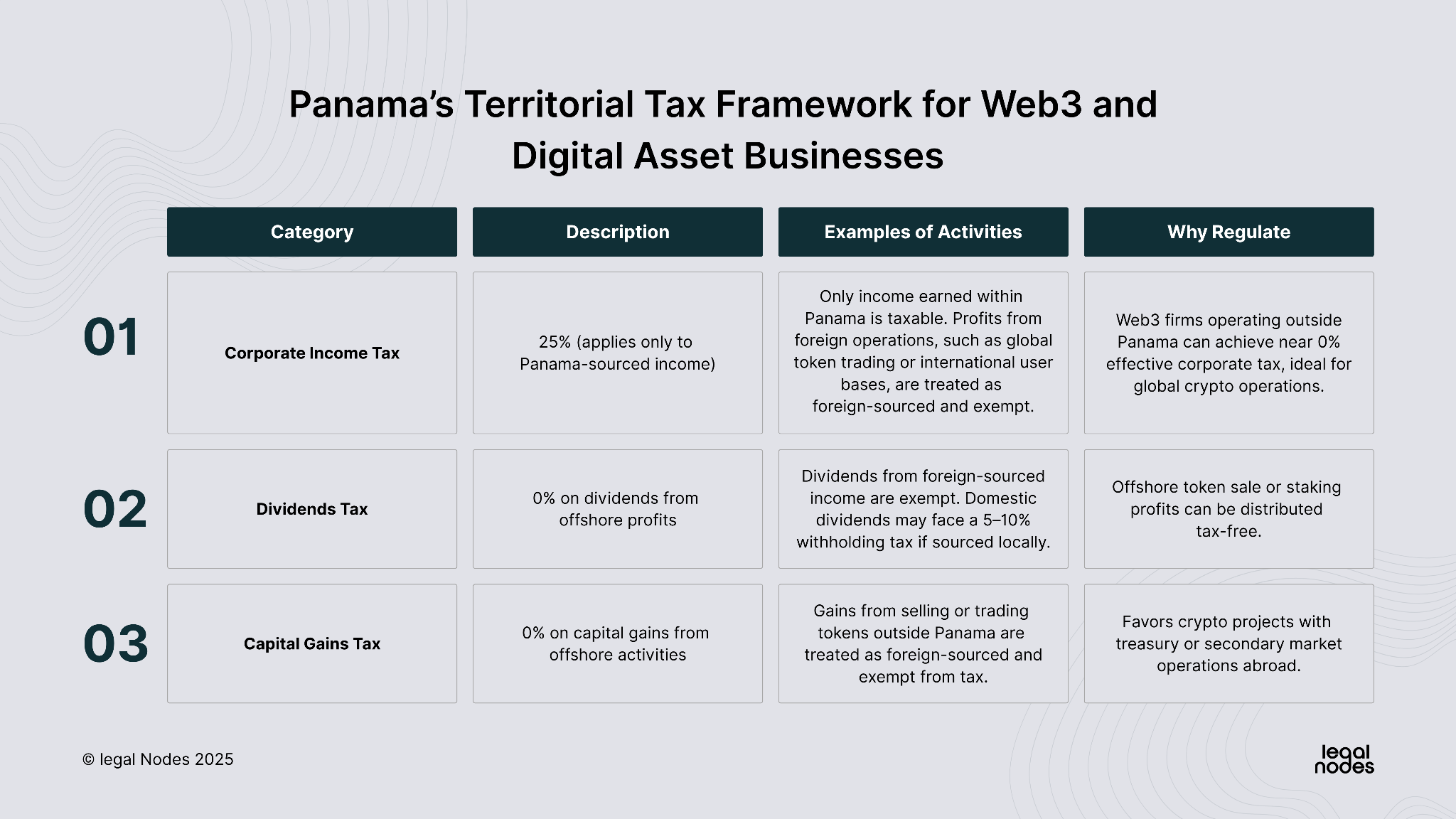 This territorial tax approach offers substantial flexibility for Web3 companies serving international clients or managing global liquidity. Nevertheless, because crypto-specific tax rules are still developing, it is critical to seek jurisdiction-specific advice on transaction structuring, revenue sourcing, and compliance before launch.